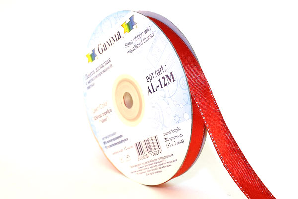 Лента атласная 12 мм двухстор. с металл. нитью "Gamma" №026красный/серебро