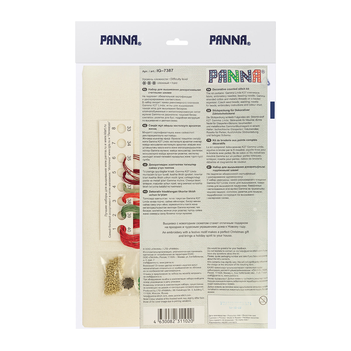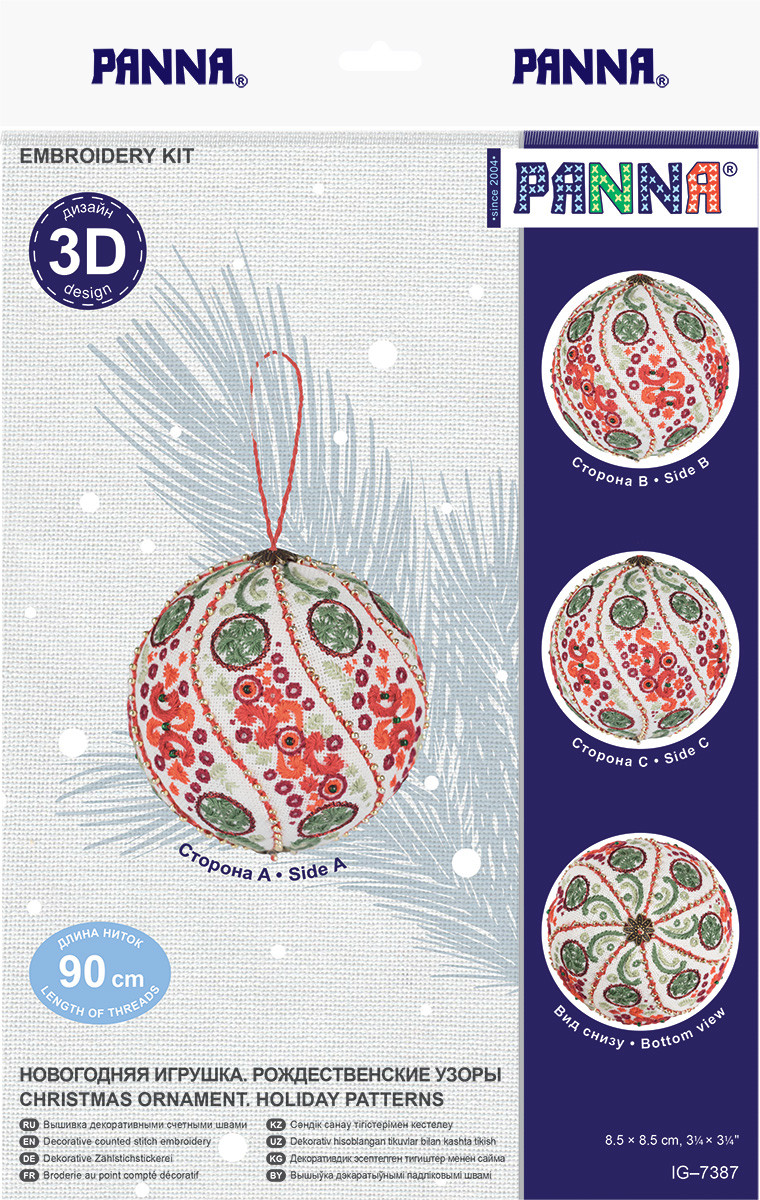 В набор для вышивания PANNA входит: канва K27 Linda Gamma, хлопчатобумажные нитки мулине Gamma, металлизированные нитки мулине Gamma, бисер, игла для вышивания Gamma, синтепон для набивки шара, фурнитура для оформления шара, цветная схема, инструкция по вышиванию и сшиванию игрушки. Размер готовой работы: 8. 5 х 8. 5 см. Особенность набора - 3D- дизайн. Вышивка с новогодним сюжетом станет отличным подарком на праздник и чудесным украшением дома к Новому году. Сообщить о неточности в описании