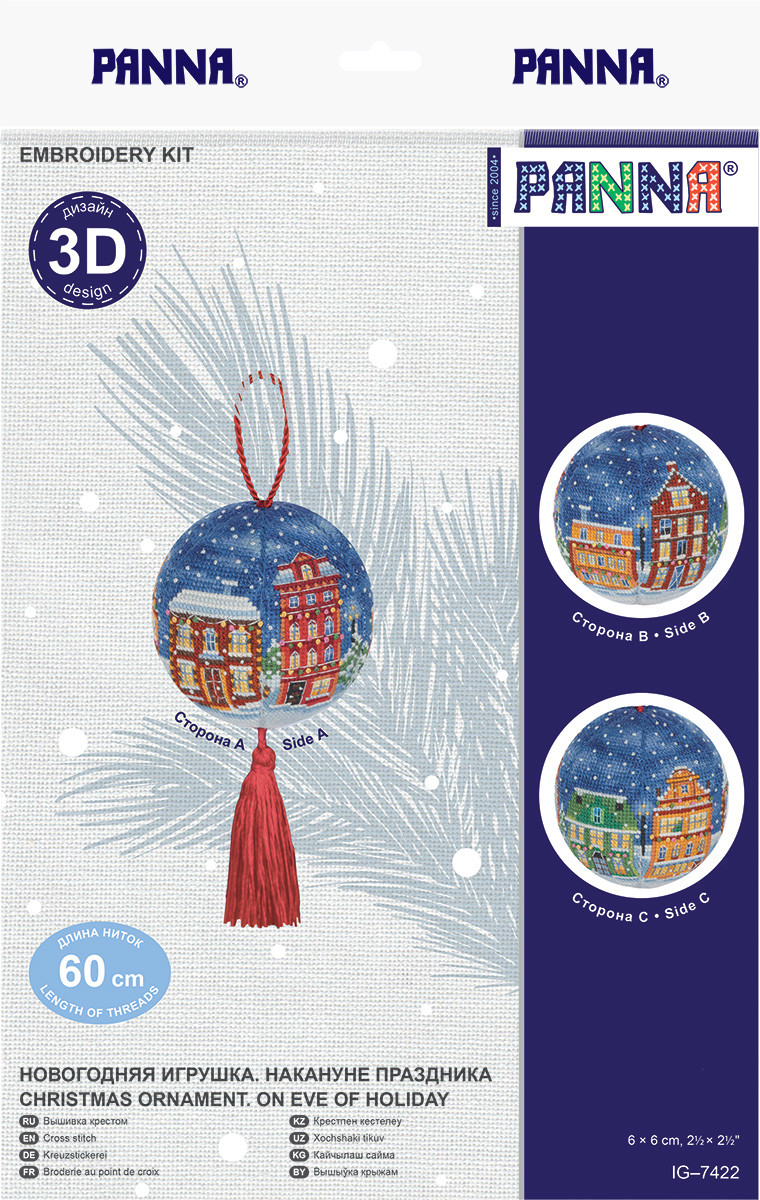 В набор для вышивания PANNA входит: канва Gamma Aida 18, хлопчатобумажные нитки мулине Gamma на держателе, вискозные нитки мулине Gamma, игла для вышивания Gamma, синтепон для набивки шара, ч/ б схема с цветными символами, инструкция по вышиванию и сшиванию игрушки. Особенность набора - 3D- дизайн. Вышивка с новогодним сюжетом станет отличным подарком на праздник и чудесным украшением дома к Новому году.  Сообщить о неточности в описании